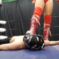 リングのロープに押しやり、ロープと巨尻で首を挟み圧迫するというデカ尻絞首刑!
